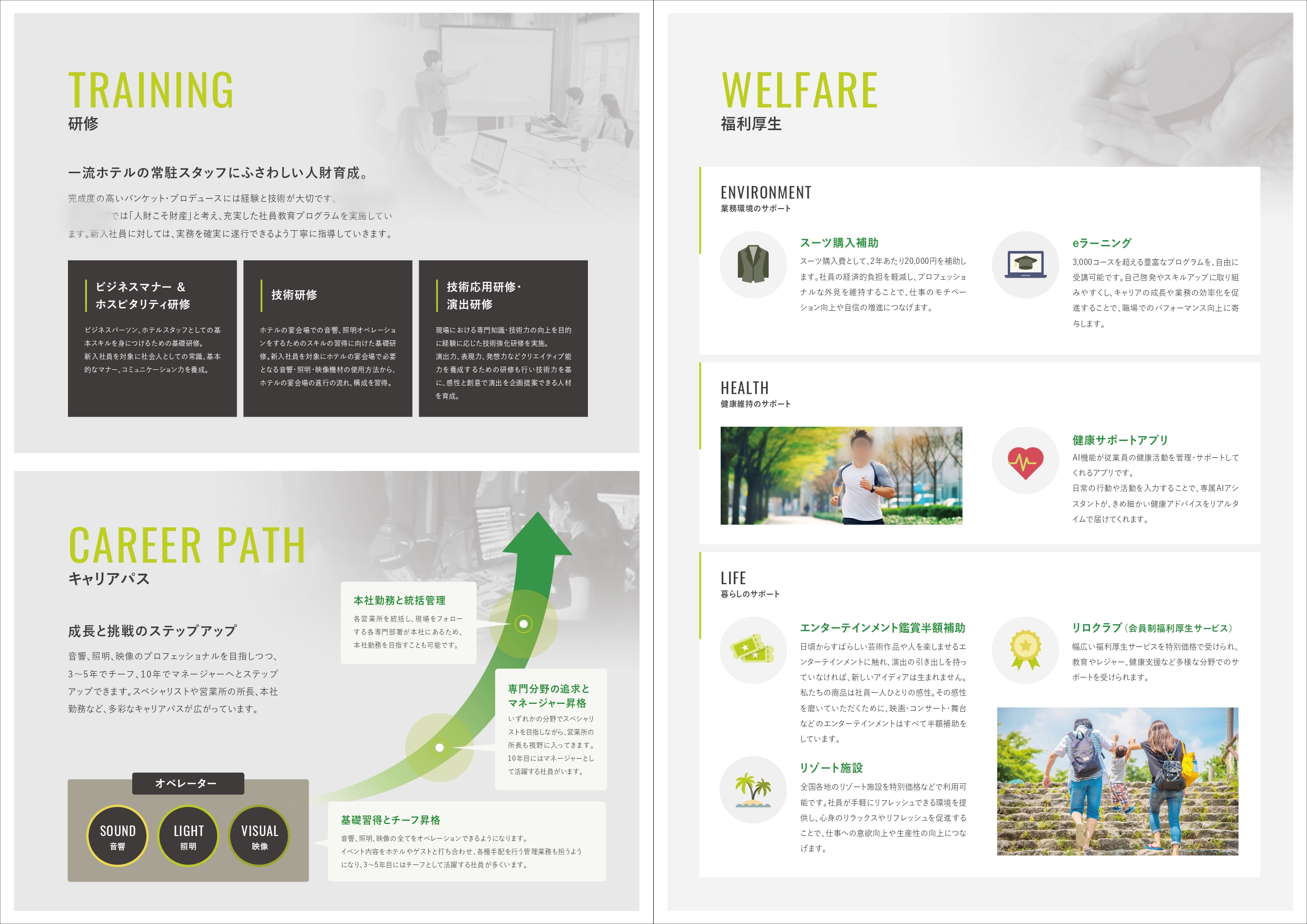 「未経験でも安心できる」ことを最優先に、社内教育やキャリアパスを図解やアイコンを用いて分かりやすく可視化しました。表紙からメッセージページにかけては、ホテルの華やかな現場風景をダイナミックに使用し、視覚的に「憧れ」を醸成するエモーショナルなデザインに仕上げました。また、社員インタビューを掲載し、入社理由や仕事のやりがい、詳細なスケジュールを紹介することで、働くイメージを具体化しました。