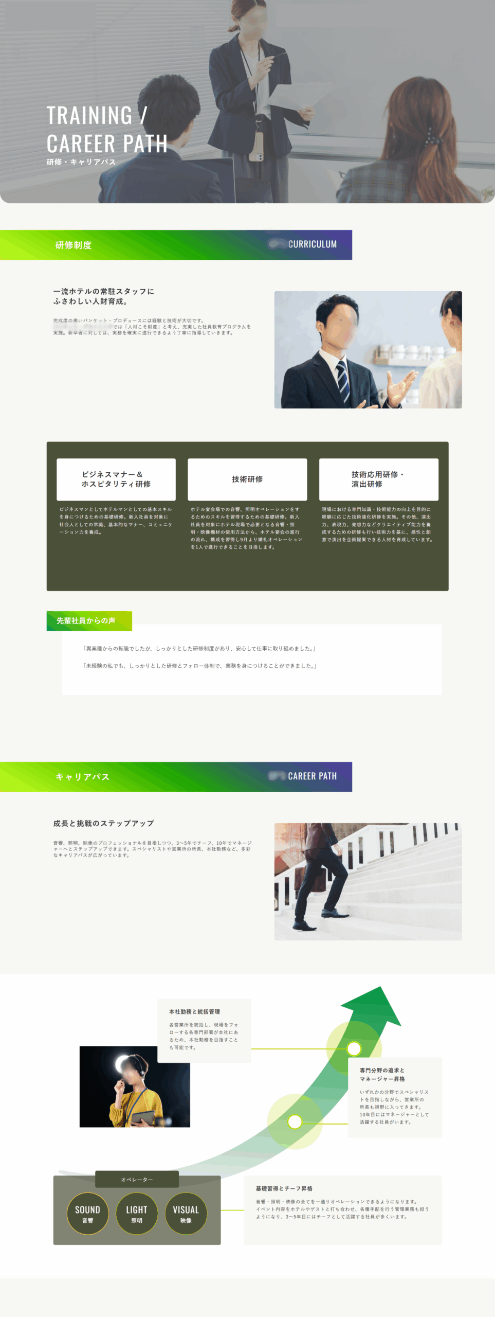 「一生ものの一瞬をつくる」をコンセプトに、音響・照明・映像の技術で最高の舞台を演出する、同社の仕事の魅力と誇りを伝える採用サイトを企画しました。主なターゲットは、専門知識を持たない未経験の大学生です。一流外資系ホテルという「非日常の空間」で、人々の心を揺さぶるエモーショナルな仕事であることを押し出し、業界未経験者が抱く心理的ハードルを払拭しつつ、仕事への憧れを抱かせる構成を目指しました。