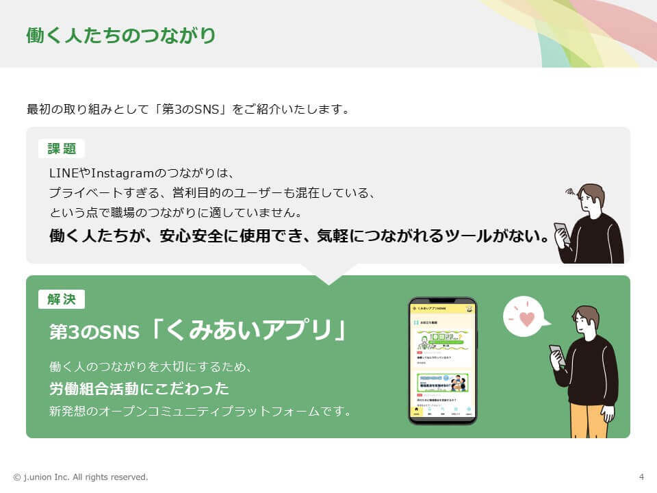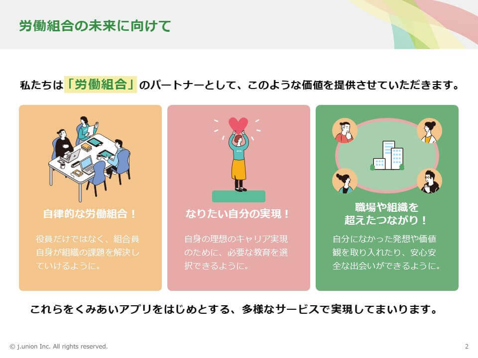 労働組合や働く人々への“想い”を起点とし、理想の労働組合像とアプリによる解決策を一貫して訴求する営業資料を企画しました。冒頭ではVISIONを提示し、中盤で「第3のSNS」としてのアプリを紹介。後半では実績・導入企業事例を紹介し、信頼性を補強する構成としました。