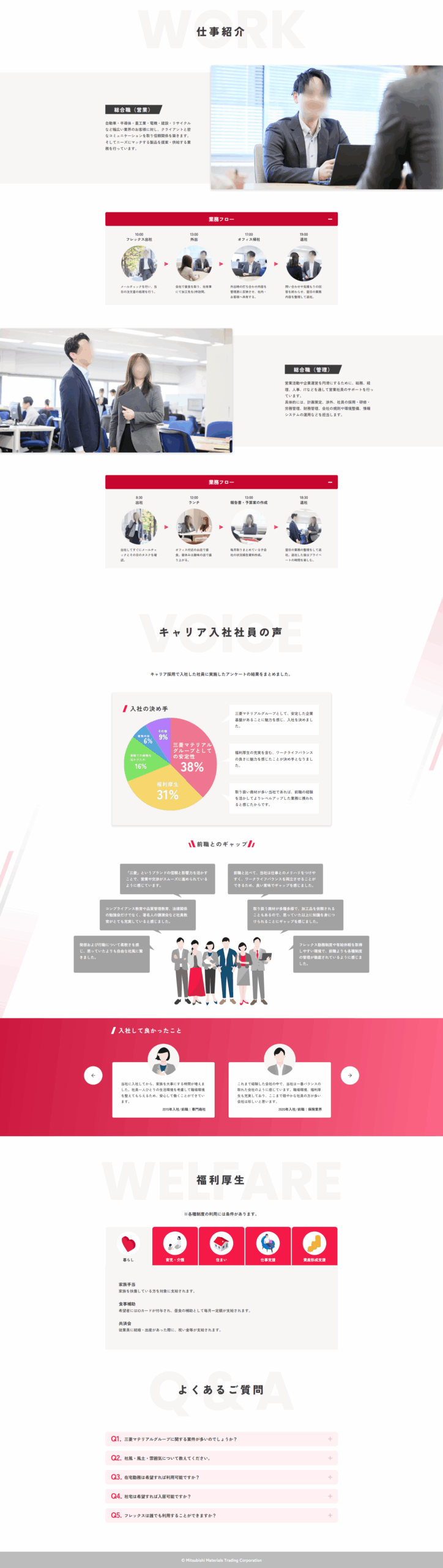 「働きやすさ」と「仕事の醍醐味」を両立させたコンテンツを設計。住宅手当などの充実した制度を分かりやすく紹介し、部署ごとの専門性をセクション分けして解説しました。既存の新卒採用サイトに合わせてスタイリッシュなデザインで仕上げました。
